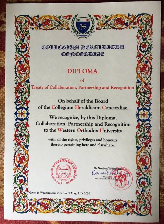 The Western Orthodox University has entered into a new reciprocal Treaty of Collaboration, Partnership and Recognition with the Collegium Heraldicum Concordiæ in Poland. The CHC was founded in 2009 to promote traditional and conservative values within society and is led by Dr Norbert Wójtowicz, who is a Fellow of the University.