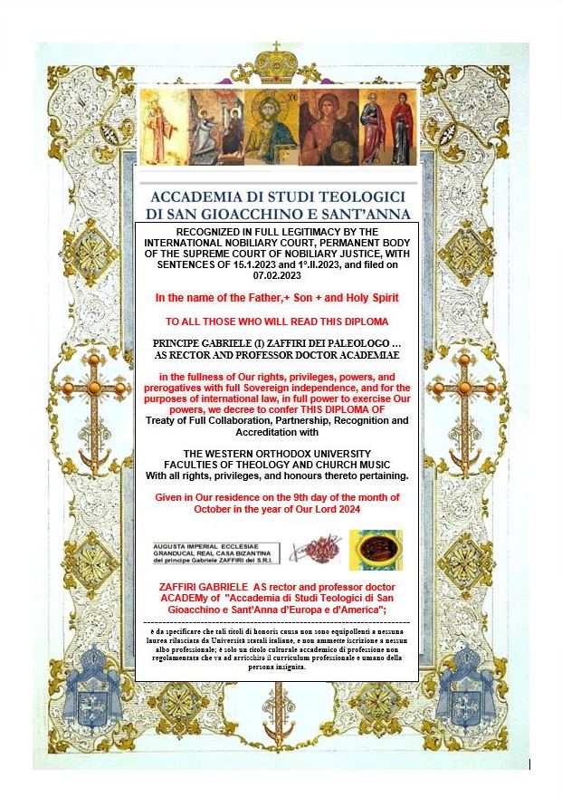 The Western Orthodox University has entered into a reciprocal Treaty of Full Collaboration, Partnership, Accreditation and Recognition with The Nobile Accademia di Santa Teodora Imperatrice – Centro di Bioetica and has also received a Certificate of Merit. The Nobile Accademia di Santa Teodora Imperatrice is an academy of international scope that is the patrimony of the Imperial Amorian Dynasty, whose head is also hereditary Magnificent Rector of the Academy. It was restored and its statutes published in 1897. In 1966 the Civil and Penal Tribunal of Rome determined that it was a subject of international law and registered it in the Public Register of Juridical Persons. The Academy is a Moral Patron of the Basilica Santa Croce, Florence, Italy (since 1968) and its members have included Cardinals and Bishops of the Roman Catholic Church.