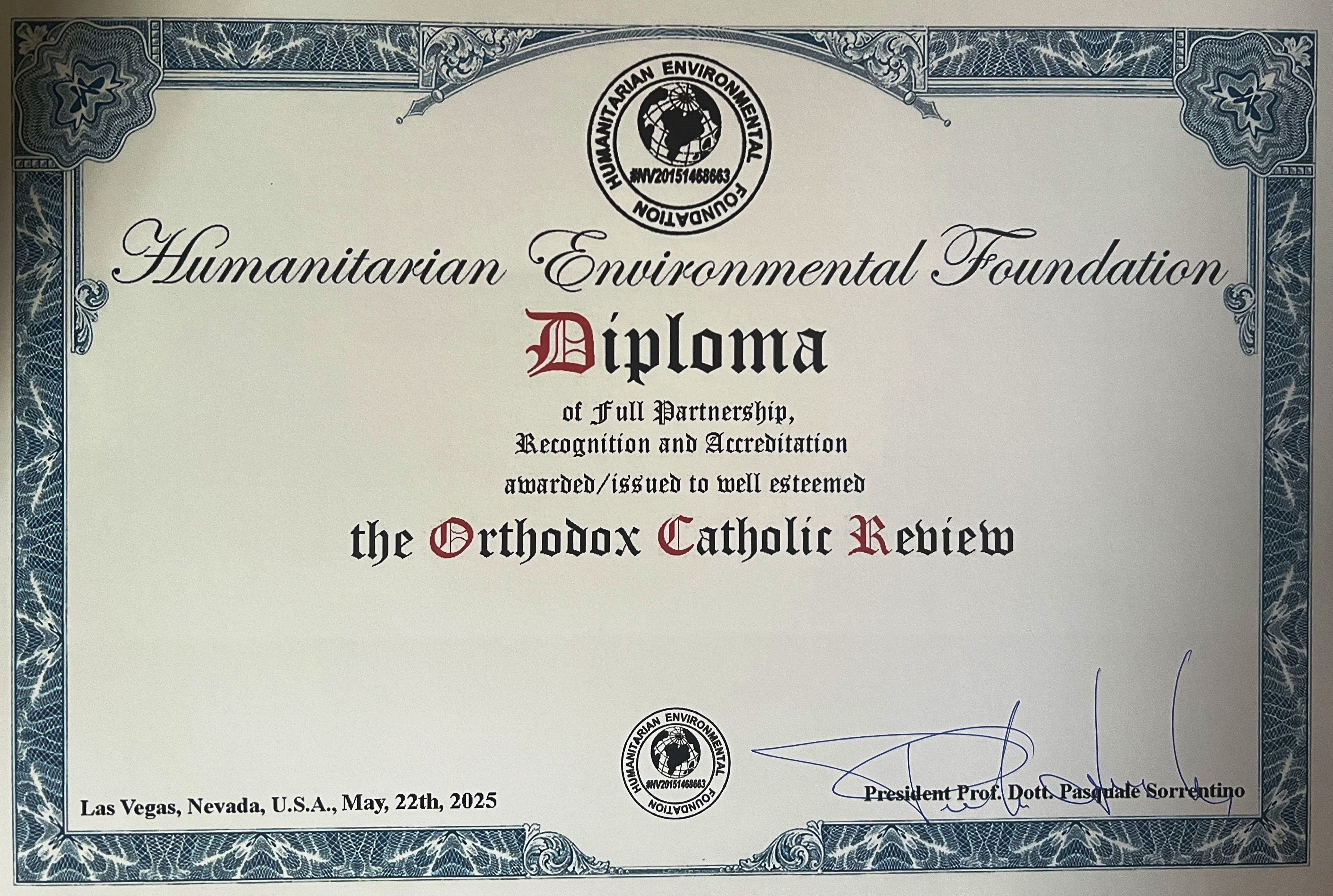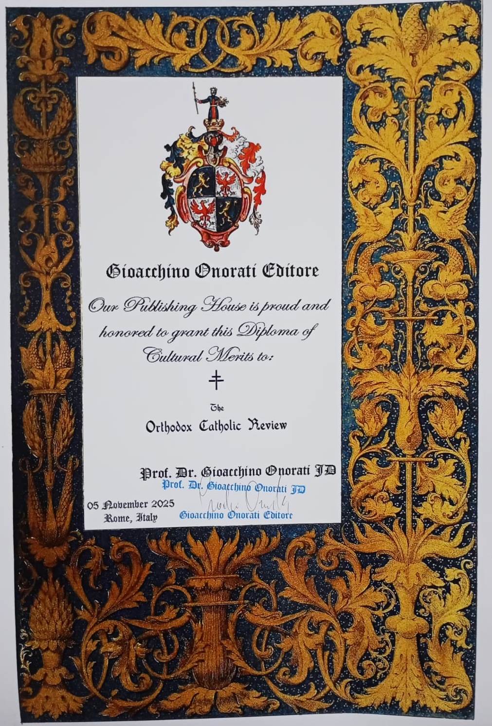 >>View Prof. Dr. Gioacchino Onorati Diploma of Cultural Merits to the Orthodox Catholic Review