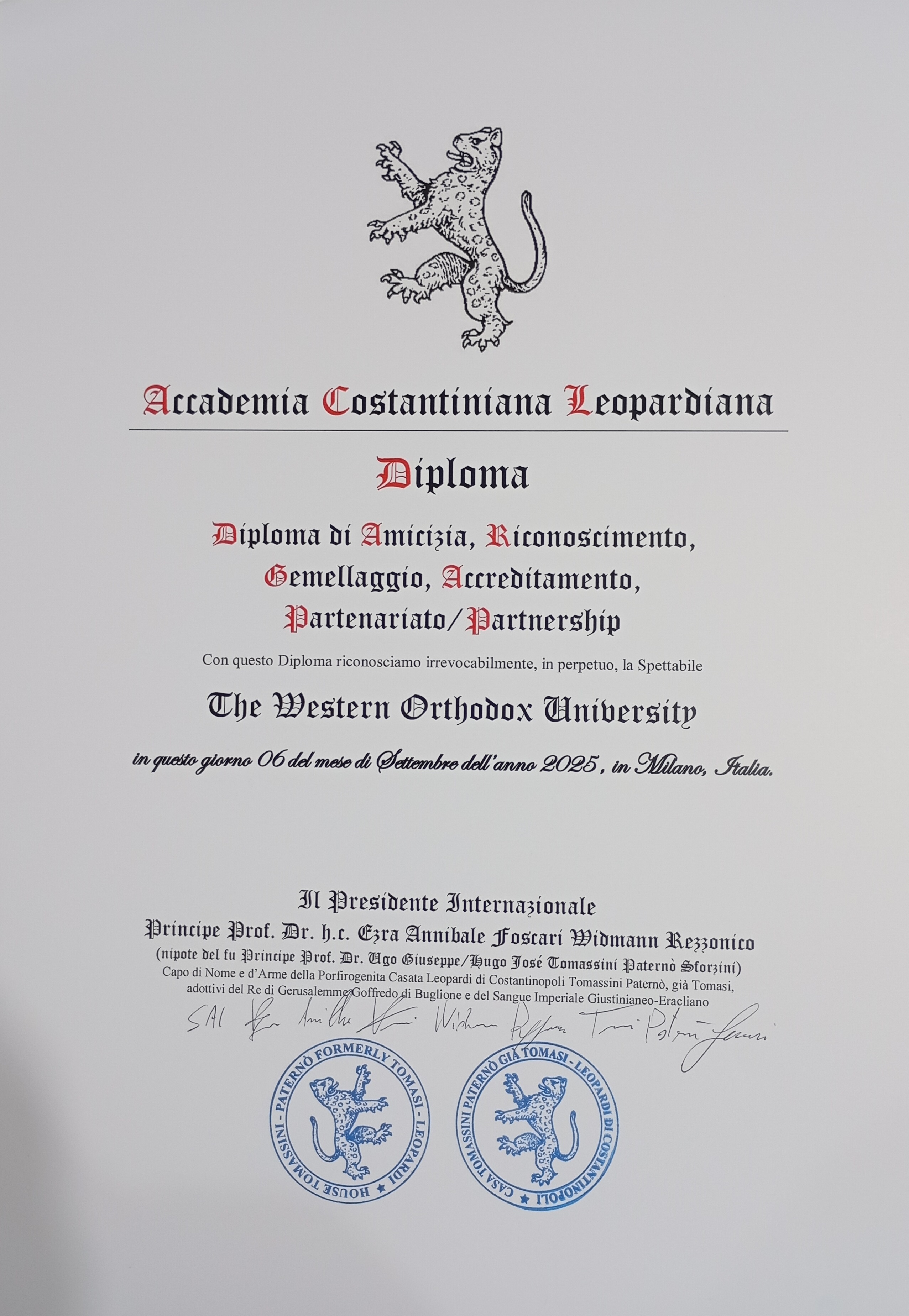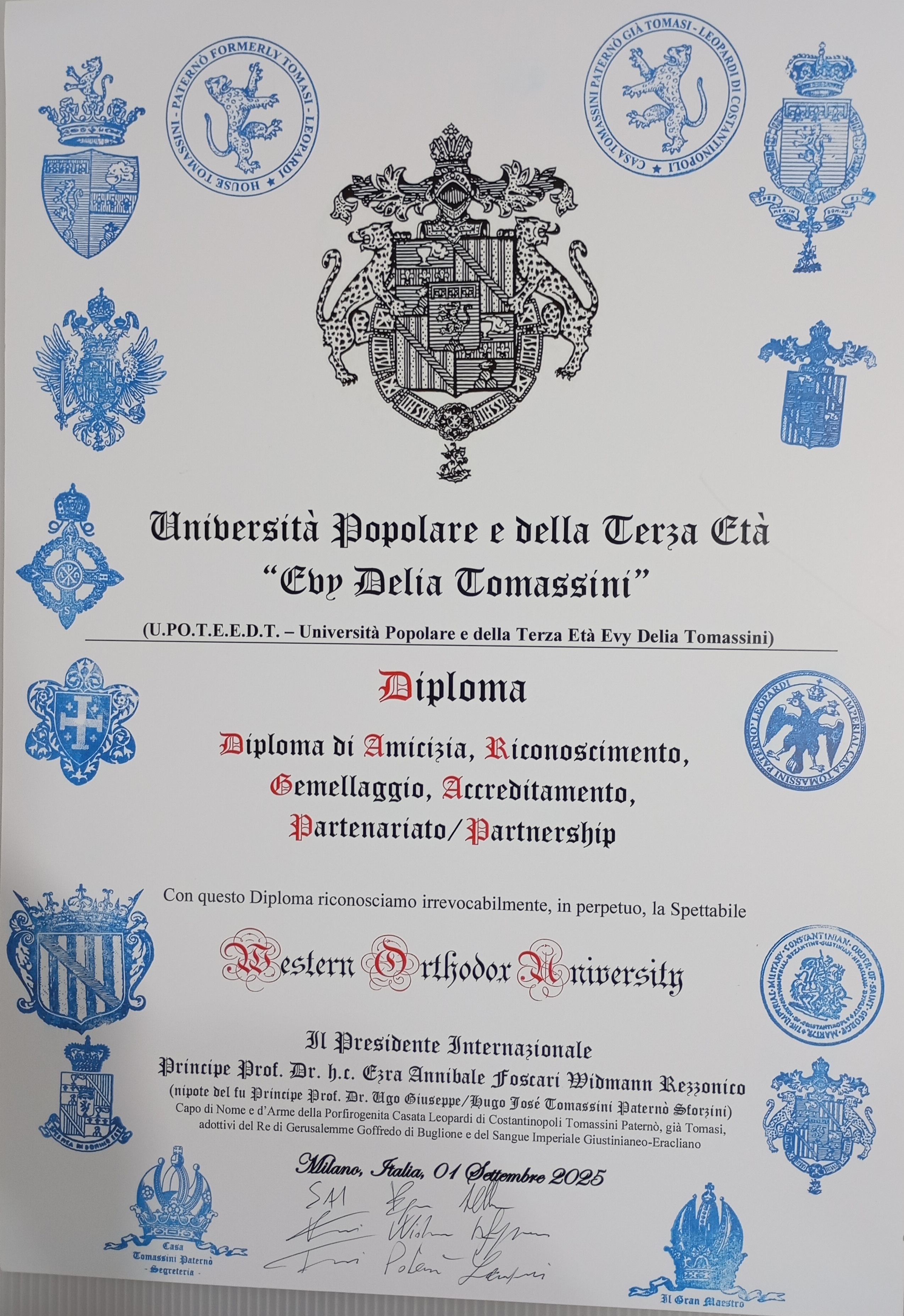 The Western Orthodox University has entered into a reciprocal Treaty of Full Partnership, Friendship, Collaboration, Accreditation and Recognition with the Reale Accademia Palatina di Dalmatia (Royal Academy Palatin of Dalmatia) based in Ferrara, Italy.