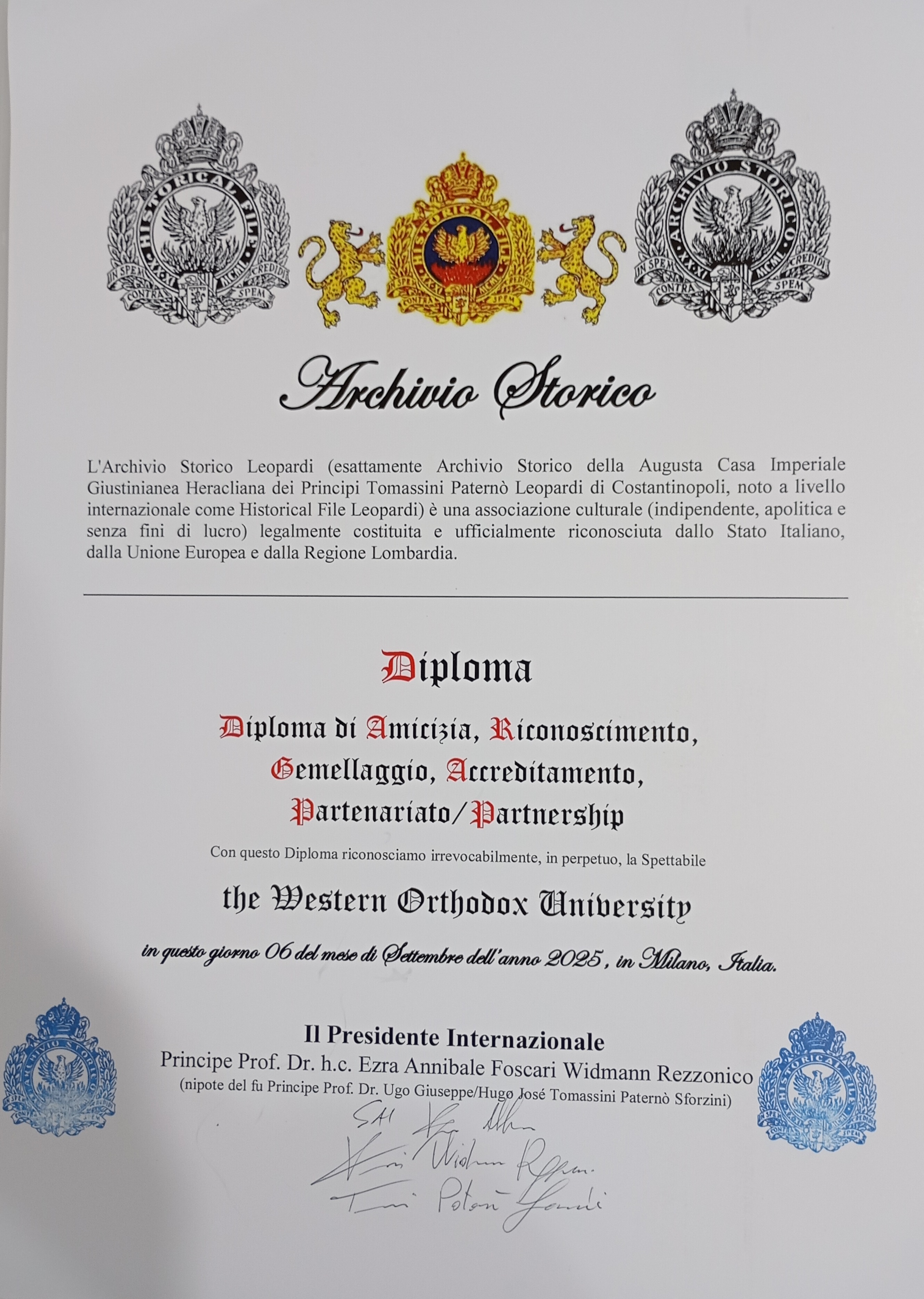 The Western Orthodox University has entered into a reciprocal Treaty of Full Collaboration, Partnership, Recognition and Accreditation with the Accademia Internazionale “Greci-Marino”, Verbano, Italy. In addition, the Western Orthodox University and its Chancellor have been accorded the honour of Academical Knight of Verbano by the Ordine Internazionale “Greci-Marino” – Ordine Accademico del Verbano.