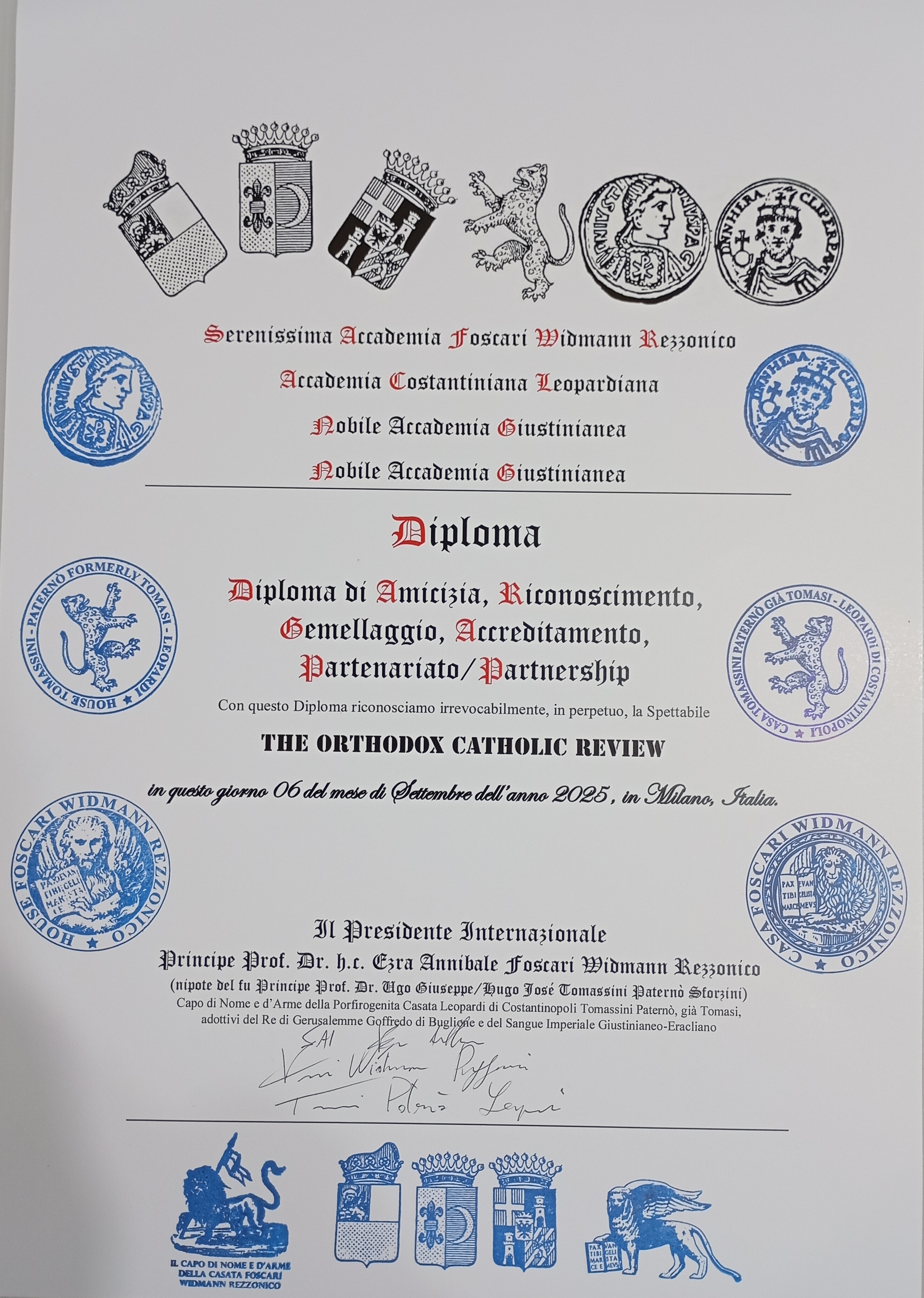 The Serenissima Accademia Foscari Widmann Rezzonico, the Accademia Costantiniana Leopardiana, and the Nobile Accademia Giustinianea have also jointly extended friendship, recognition, accreditation, twinning and partnership to the Orthodox Catholic Review:
