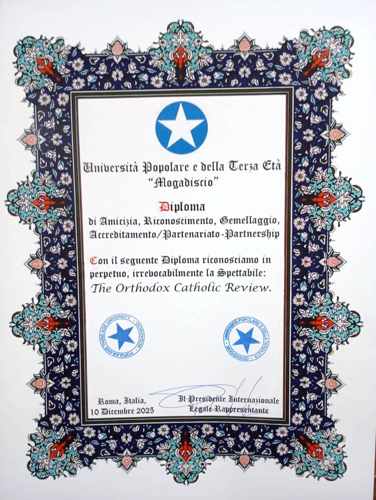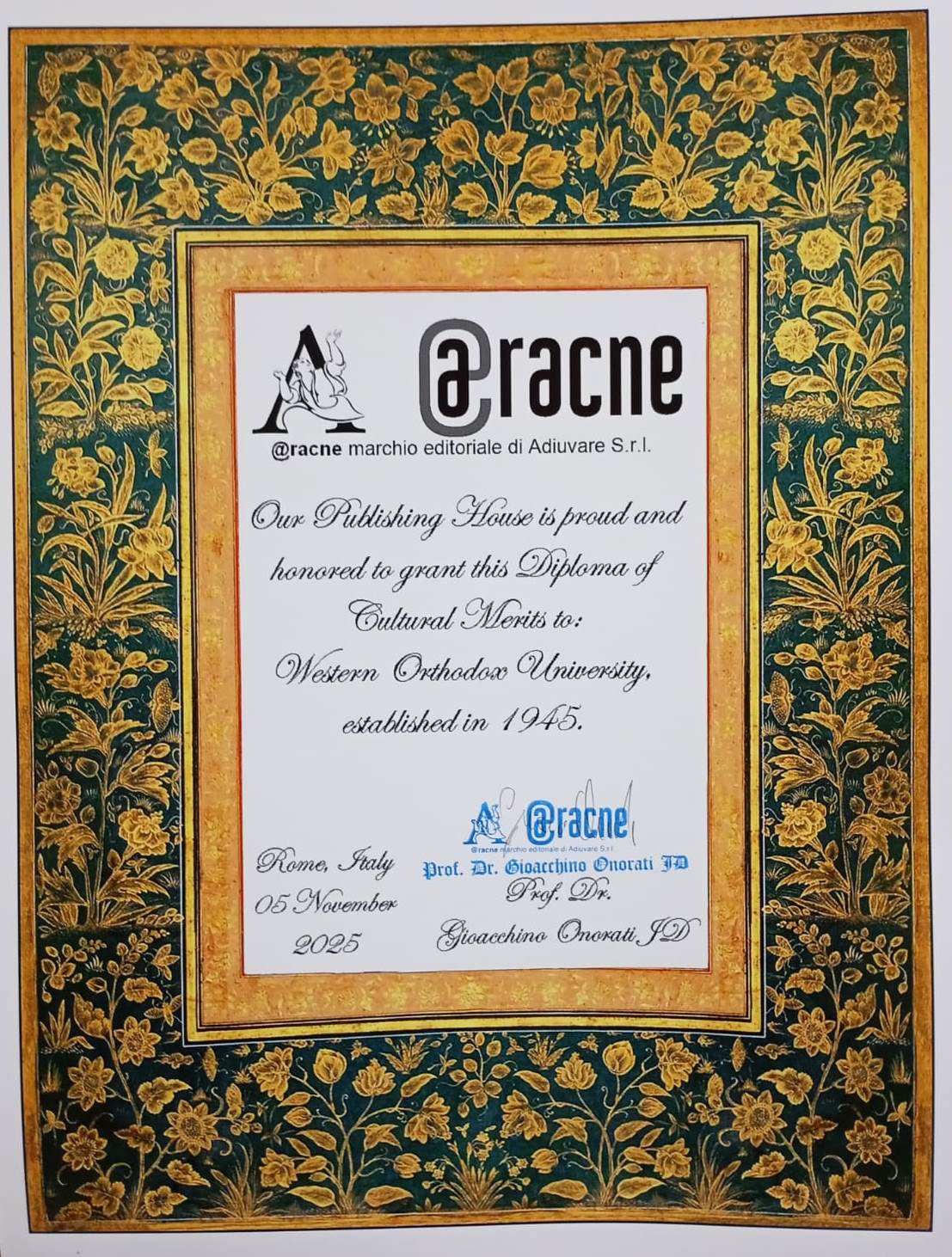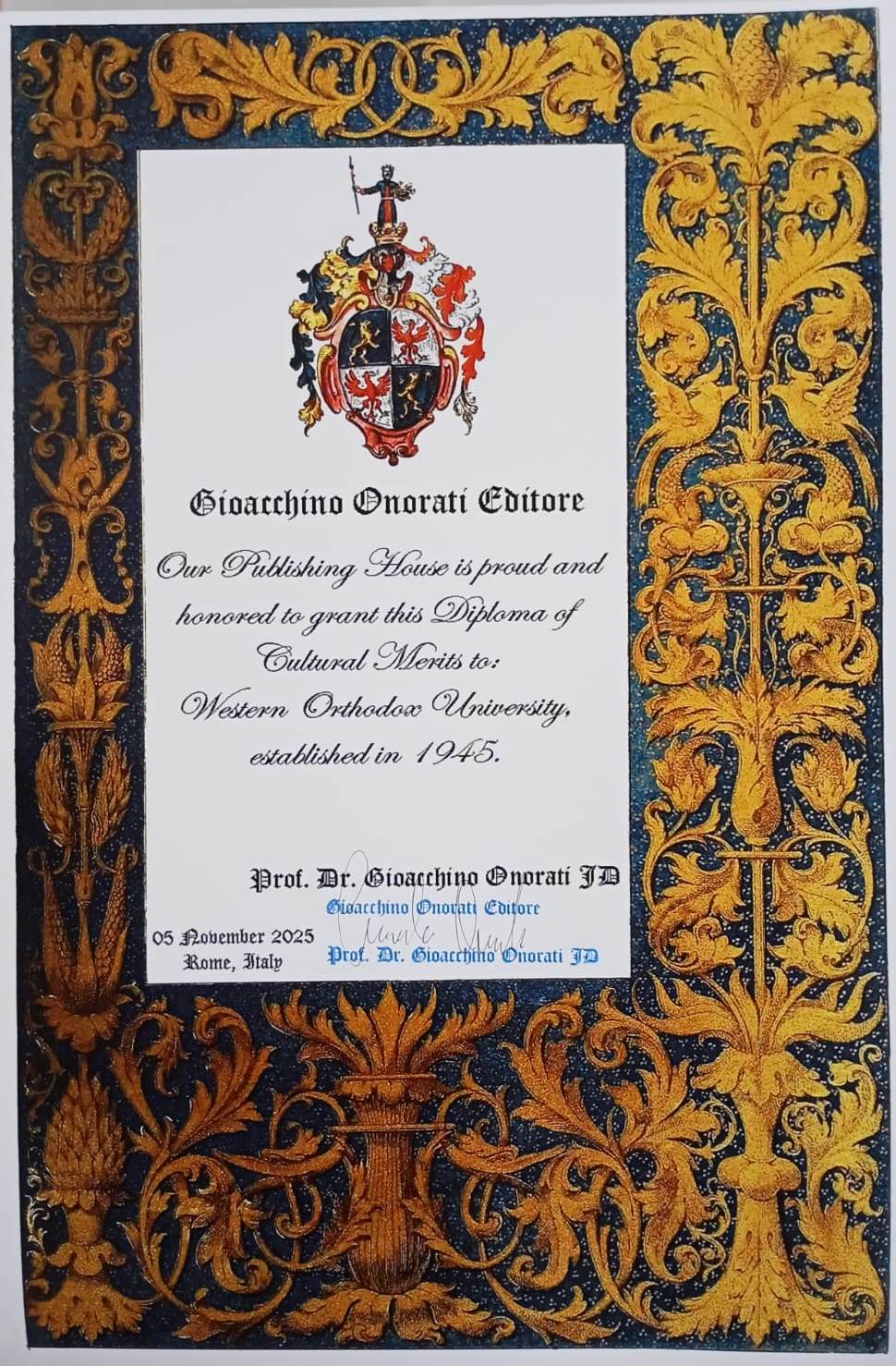 The Western Orthodox University and the Orthodox Catholic Review have received Diplomas of Cultural Merits from the publishing houses Aracne Editrice, La Bussola Edizioni and Aracne TV, based in Rome, Italy, and their founder Prof. Dr Gioacchino Onorati.