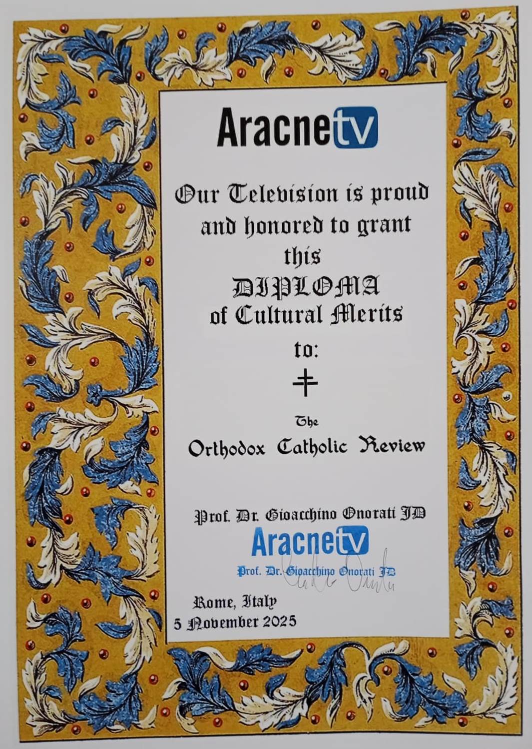 >>View Aracne TV Diploma of Cultural Merits to the Orthodox Catholic Review