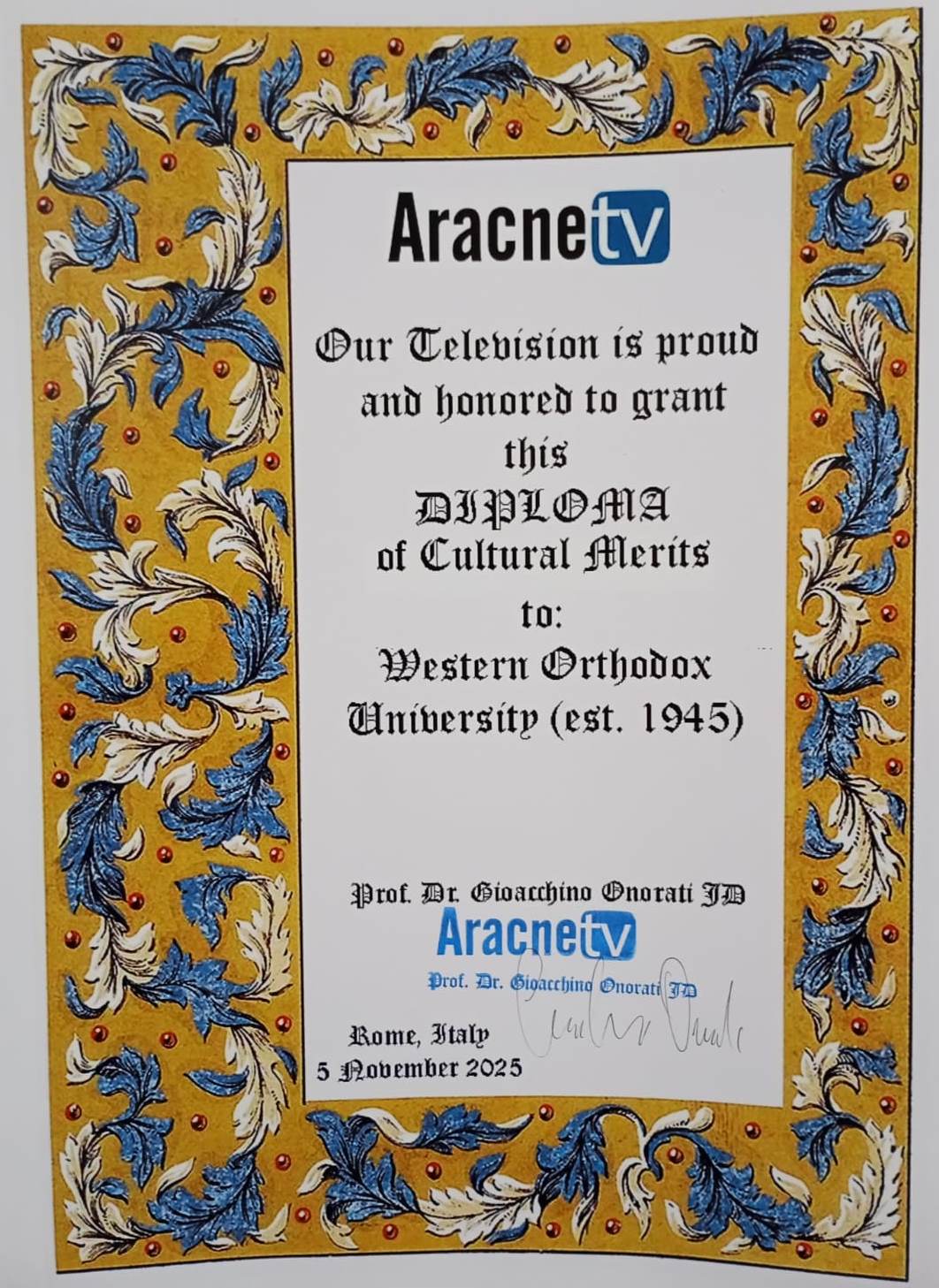 >>View Aracne TV Diploma of Cultural Merits to The Western Orthodox University