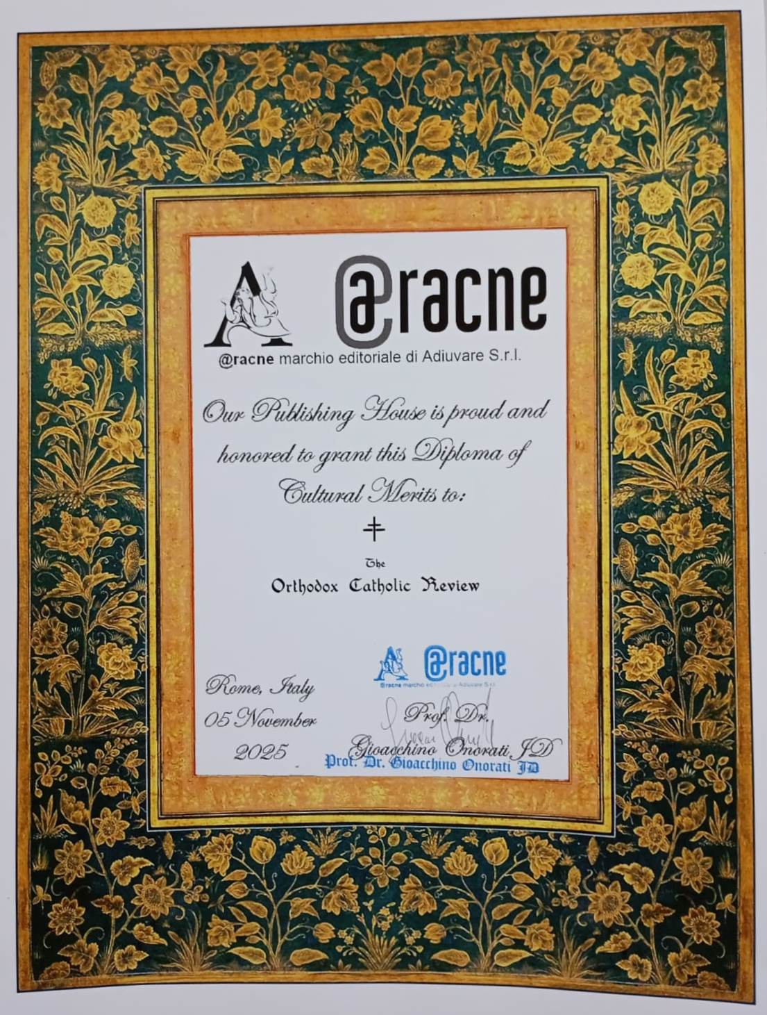 >>View Aracne Editrice Diploma of Cultural Merits to the Orthodox Catholic Review