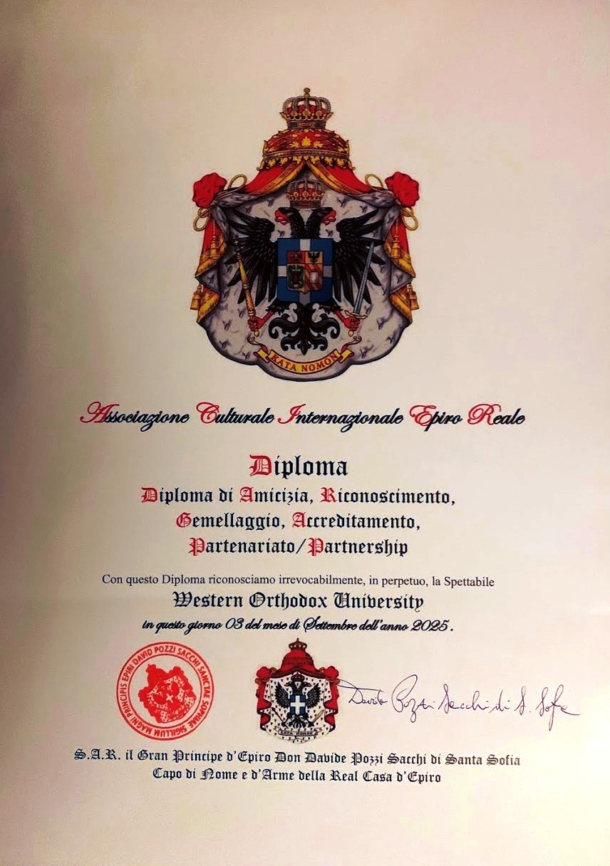 The Western Orthodox University has entered into a reciprocal agreement of Full Collaboration, Partnership, Accreditation and Recognition with the Real Accademia d’Epiro, the academy of the Royal House of Epirus (in exile). For further information, see this page.