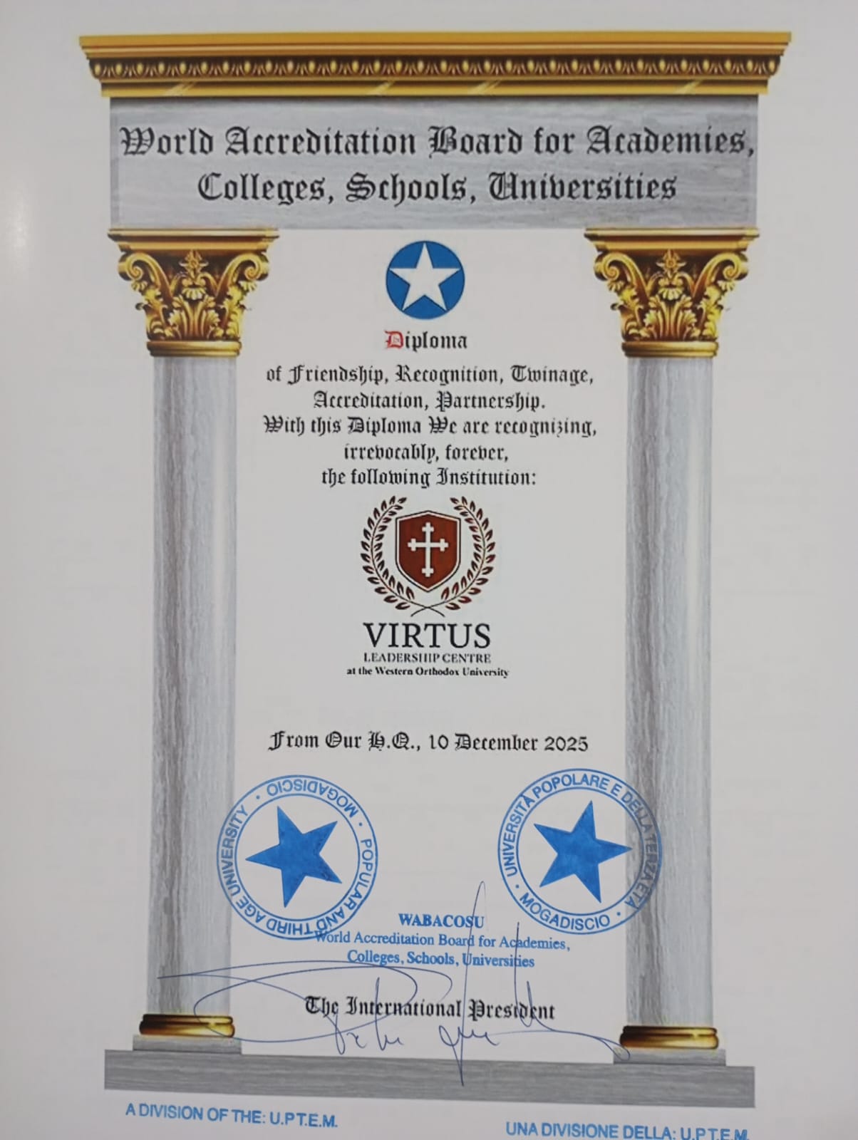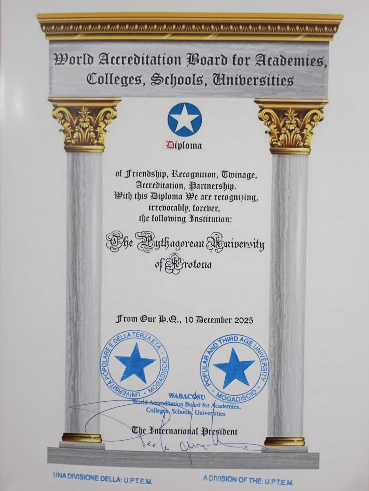 WABACOSU is a division of the Università Popolare e della Terza Età “Mogadiscio” established to further high and humane standards in the provision of education, particularly for adults. Both the University, its Virtus Leadership Center, and the University’s incorporated institution The Pythagorean University of Krotona have entered into mutual full agreements of friendship, recognition, twinning, accreditation and partnership with WABACOSU.
