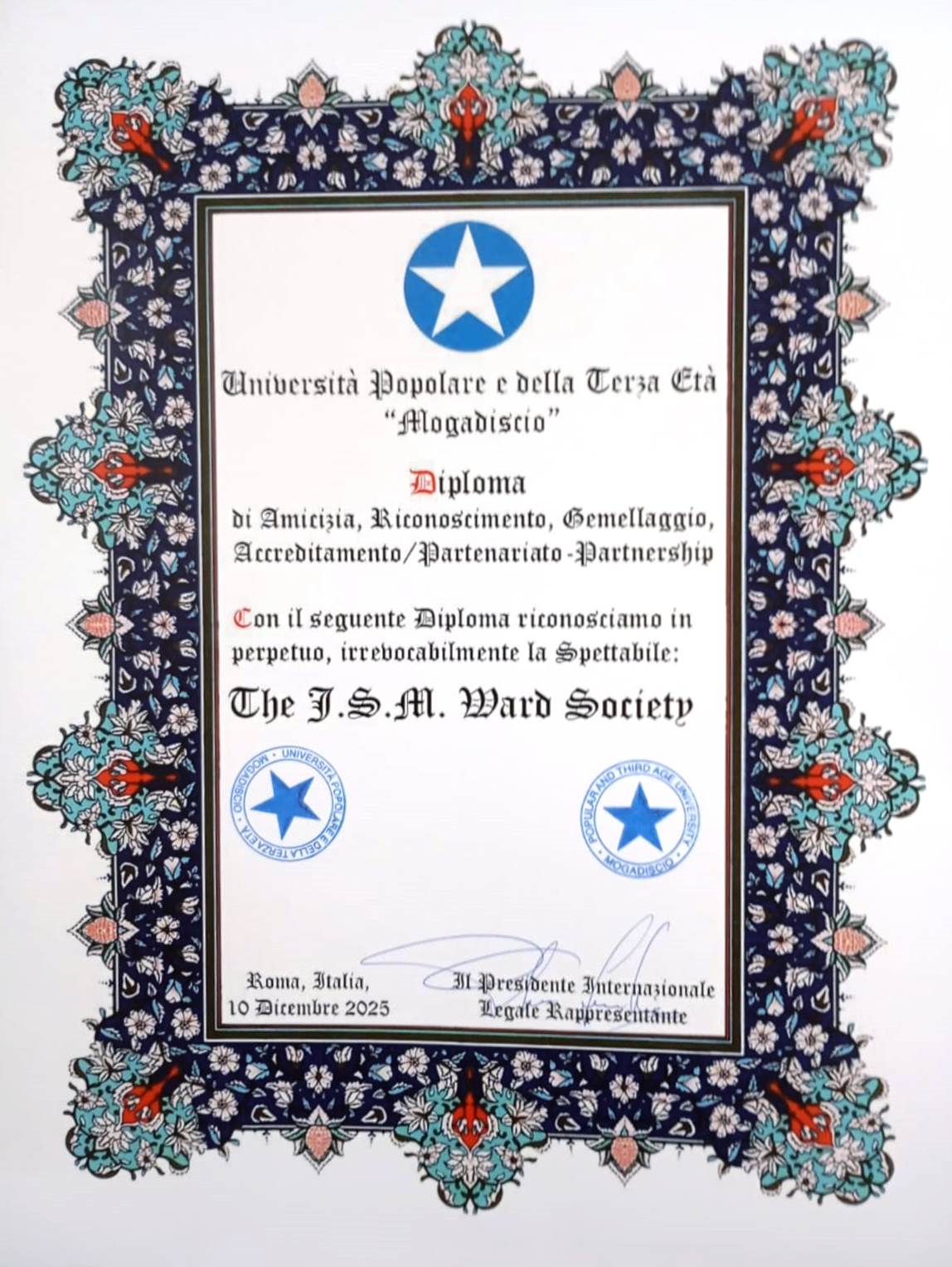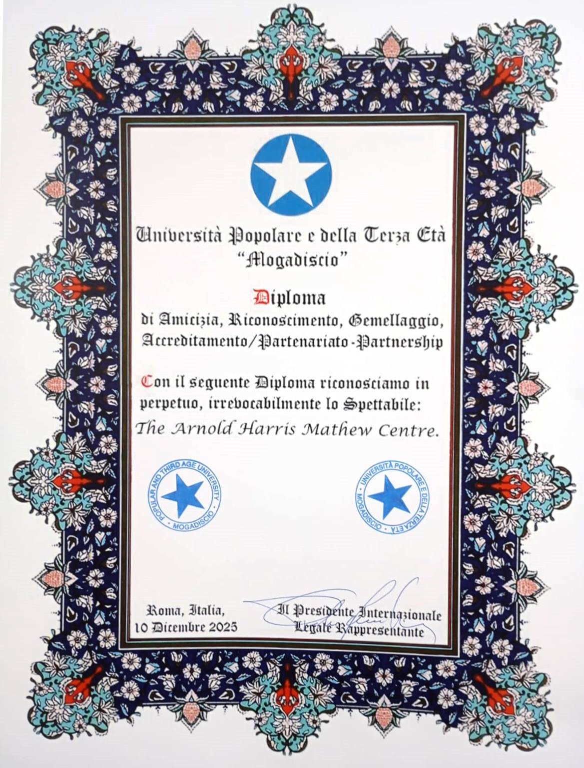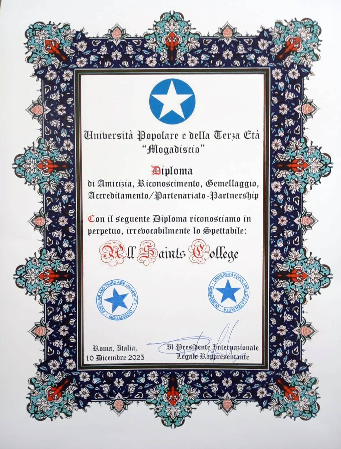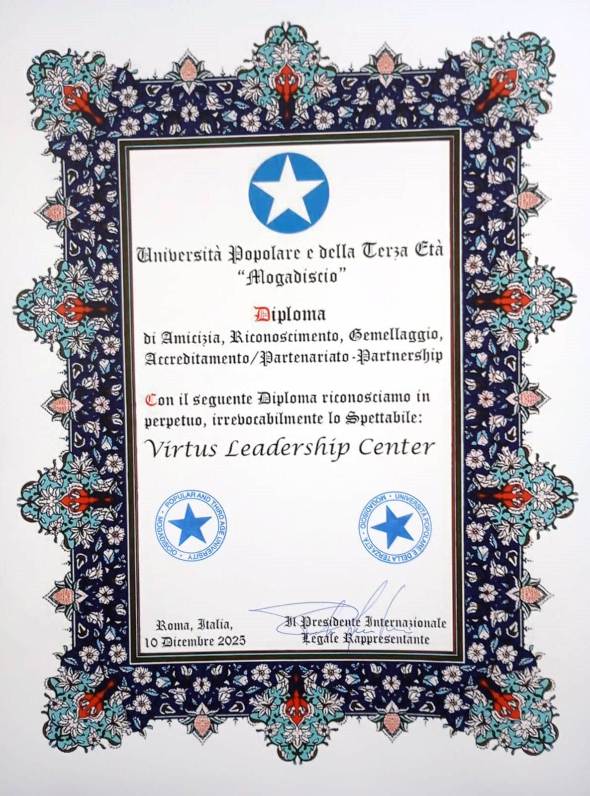 The Università Popolare e della Terza Età “Mogadiscio” is a private university after the model of the Italian “universities of the people” registered in Rome in 2025 and with a wide ranging mission of cultural, social and religious education. The University has entered into a mutual full agreement of friendship, recognition, twinning, accreditation and partnership with this University and a number of its constituent bodies.