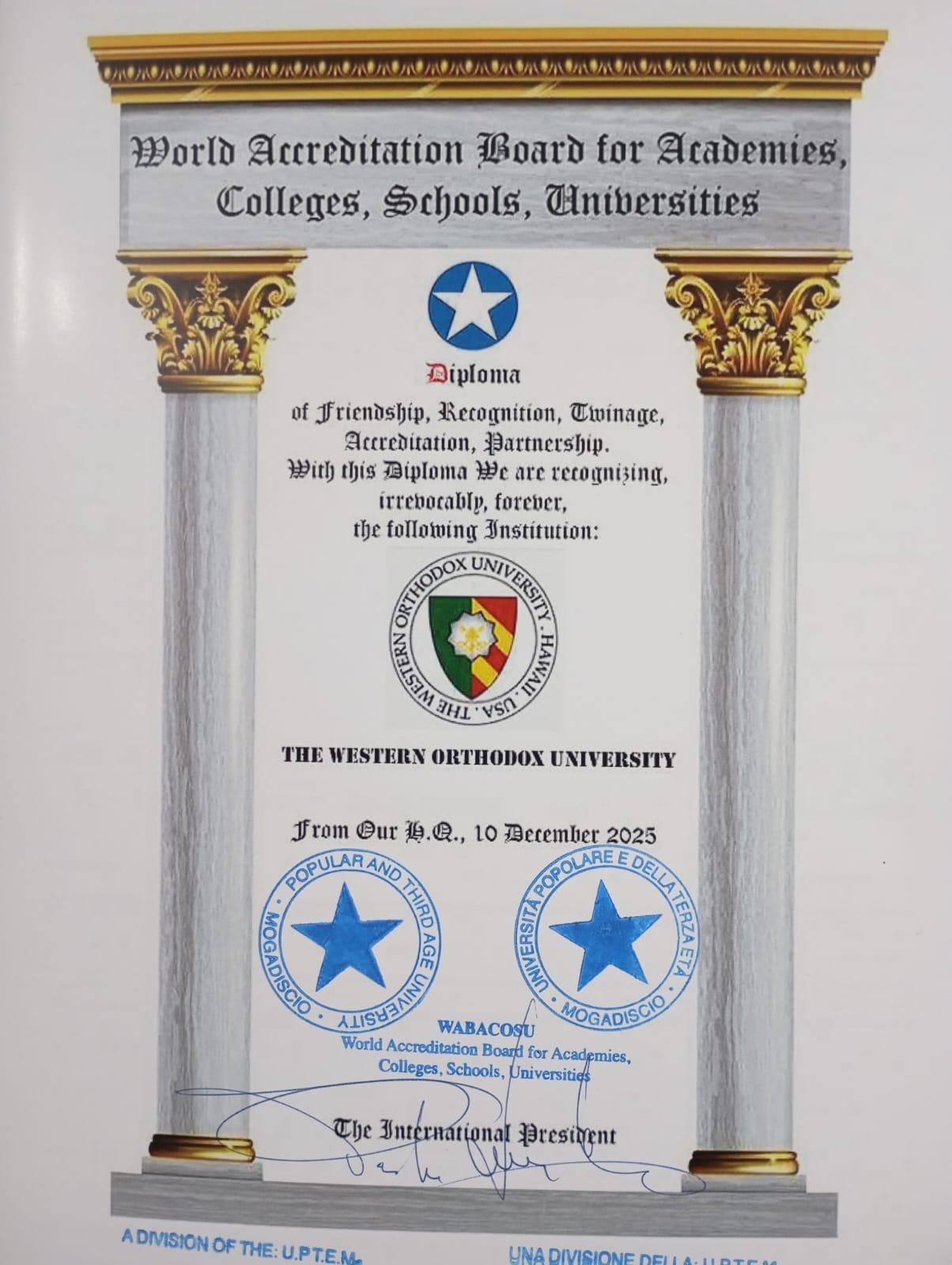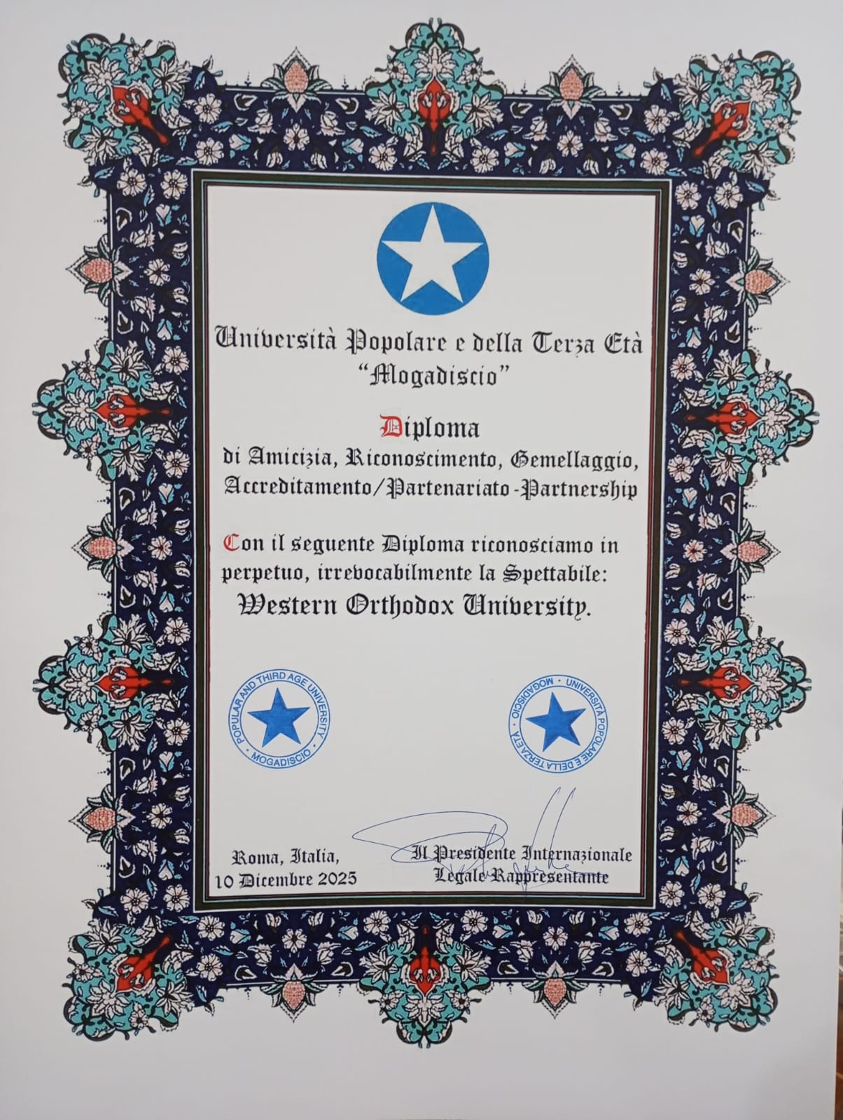 The Western Orthodox University has entered into a reciprocal Treaty of Full Collaboration, Partnership, Accreditation and Recognition with The International University SAADAUD – Centre of Bioethics and Human Rights and has also received a Certificate of Merit. The International University SAADAUD was founded in Mogadishu, Somalia, in 1980, by H.E. Prince Dr Ali Moallim Hussen, traditional King of the Hiran Region, who became its first Rector. It was registered with and recognized by the Government of Somalia. The Centre of Bioethics and Human Rights was established by Rectoral Decree in 2006. For further information see this page.